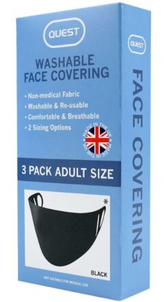 Quest face coverings are suitable for adults. They are breathable, comfortable to wear and come with 2 different sizing options.
